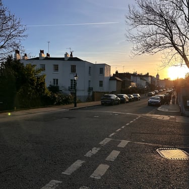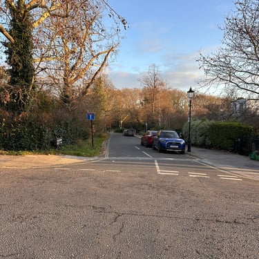 As ruas de Hampstead têm uma arquitetura mais antiga e densa do que Barnes. Fachadas georgianas, tijolos escurecidos pelo tempo, portas profundas, janelas proporcionais. A luz bate nessas superfícies e ressalta a textura do material. Nada parece plano.