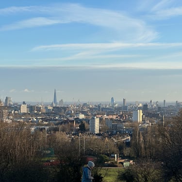 Subir até o Hampstead Heath muda o corpo. A caminhada é mais inclinada, o ar é mais aberto e, quando se chega ao alto, Londres se espalha em camadas. O skyline surge discreto no fundo, enquanto o céu ocupa a maior parte da cena.